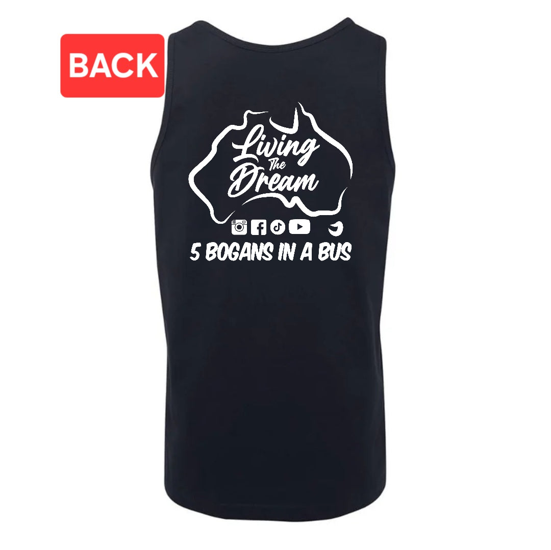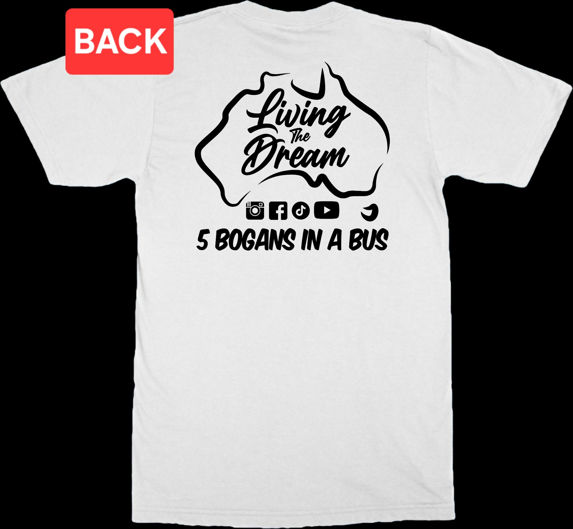 Get the '5 bogans in a bus' design on the front and one on the back of a tee, singlet, or long sleeve shirt.