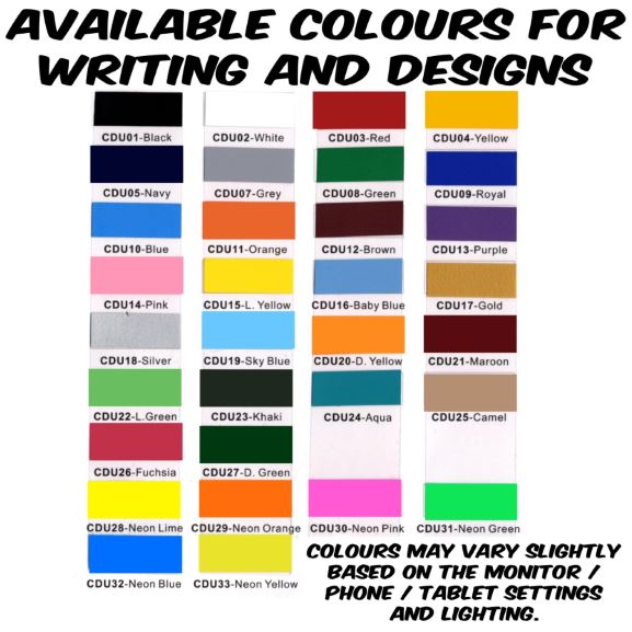 Please view the colour chart and choose the colour print (Design on apron) you would like and leave it in the notes section provided (Called 'Add note for seller' near the 'review order' section alternatively send us a message telling us which colour you would like the design). If no colour is left you will get white on a black apron.