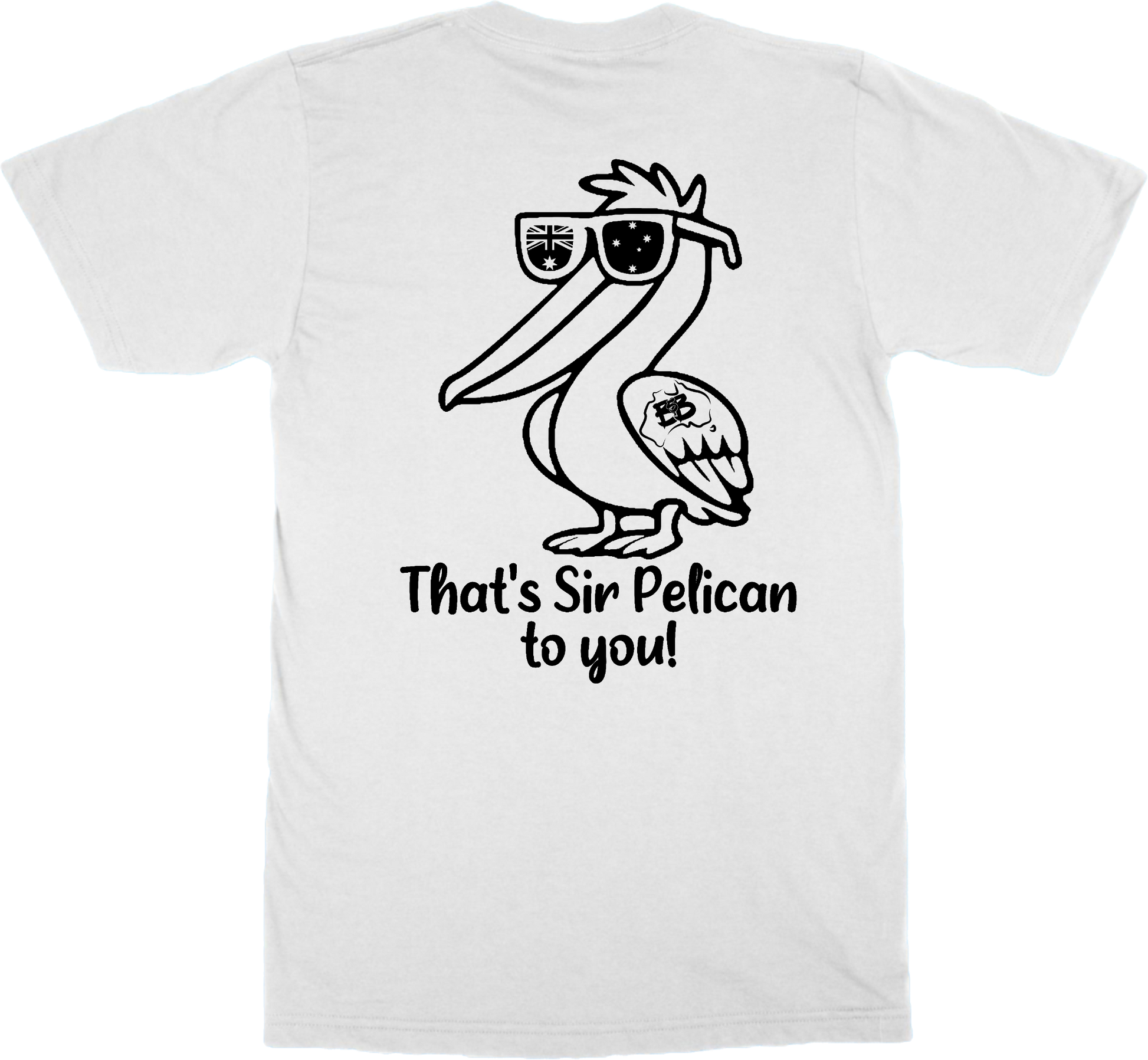 Get the 'That's sir pelican to you' design on the front and one on the back of a tee, singlet, or long sleeve shirt.