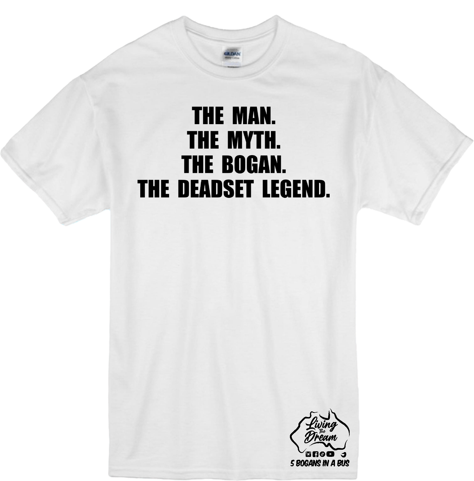 Get the 'The Man. The Myth. The Bogan. The Deadset Legend.' design on the front and one on the back of a tee, singlet, or long sleeve shirt.